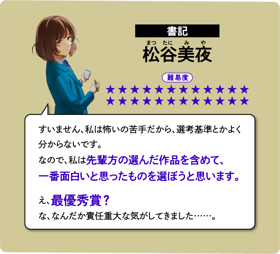 - 最優秀賞(松谷美夜賞):3万円分ギフトカード、 梨氏サイン本、 梨氏選評コメント